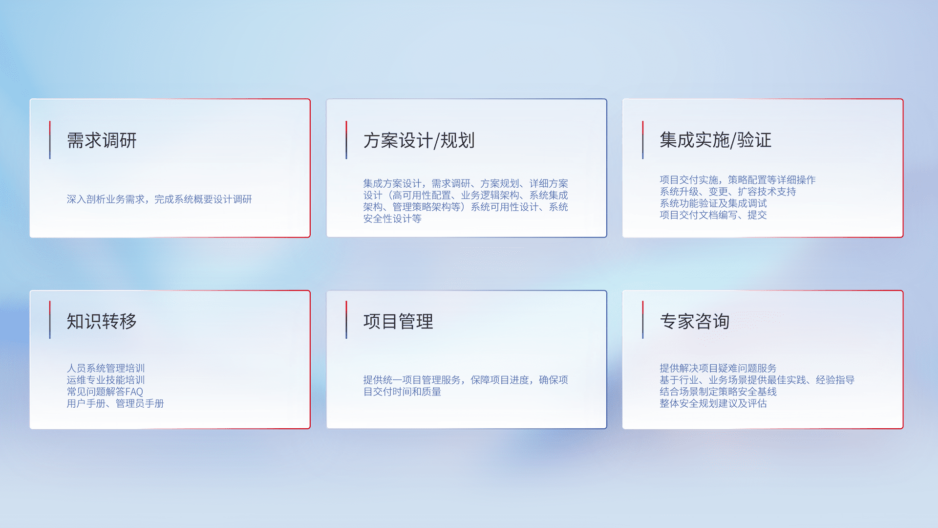 针对客户行业特性,,将宏观的安全战略和需求,,,,通过专业的交付服务,,,实现项目落地,,,,为客户提供标准规范的集成交付服务。。