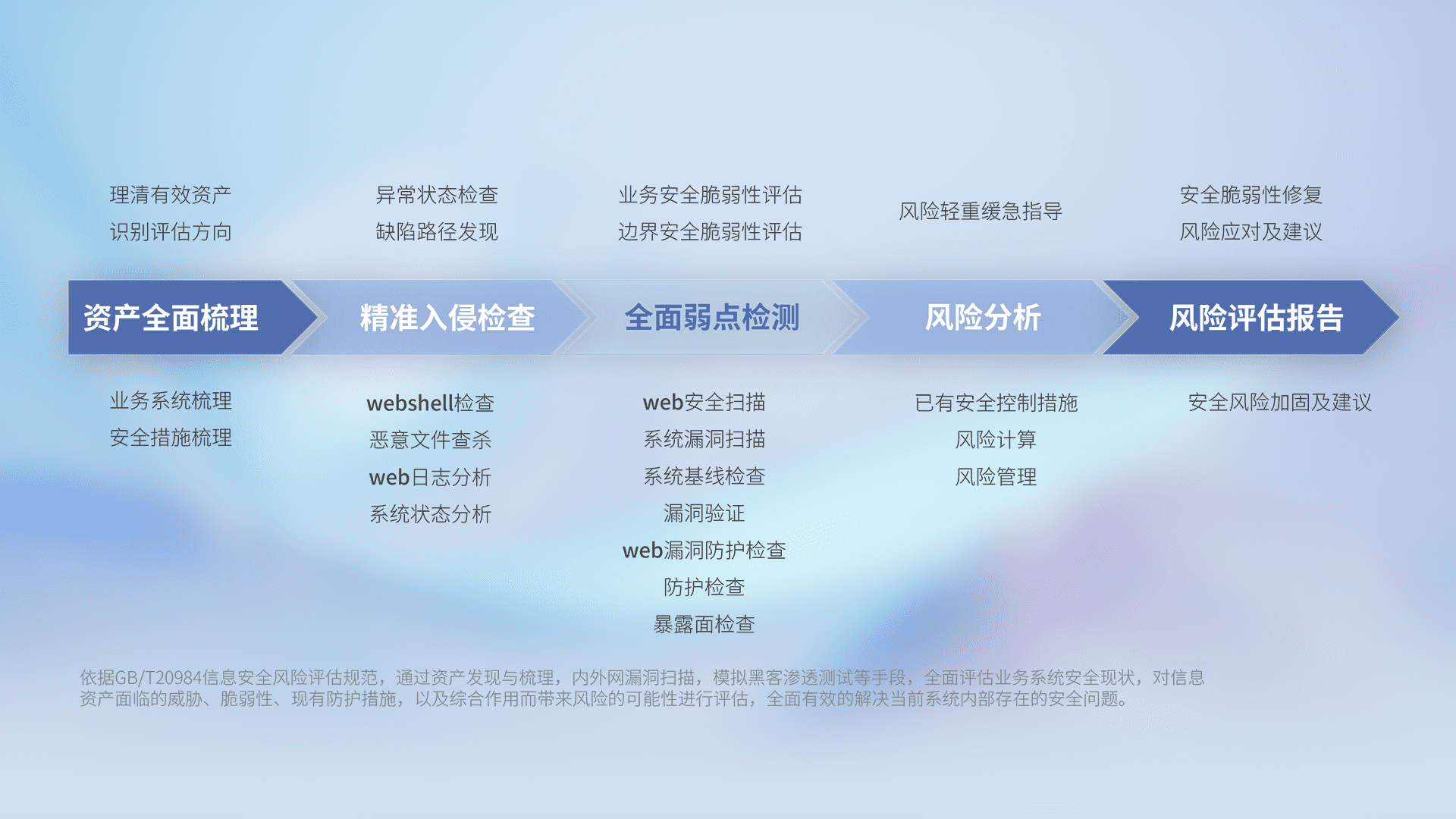 针对客户行业特性,,,以专业的安全服务+多厂商联合解决方案提供专属的一站式安全管理服务,,,,帮助客户全面感知网络空间威胁,,基于识别、、、检测、、、、分析、、、防护、、、监测、、、响应的服务理论模型,,,,从方案咨询、、、、集成交付、、、、评估验证、、、、优化加固、、、运维运营,,致力于为客户提供完整的闭环管理式安全服务。。。以实战经验为客户打造高抵御风险的安全体系,,,,帮助客户发现威胁、、、、对抗威胁、、、、处置威胁,,,不断积累安全对抗能力,,,,持续保障数字化安全。。